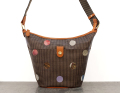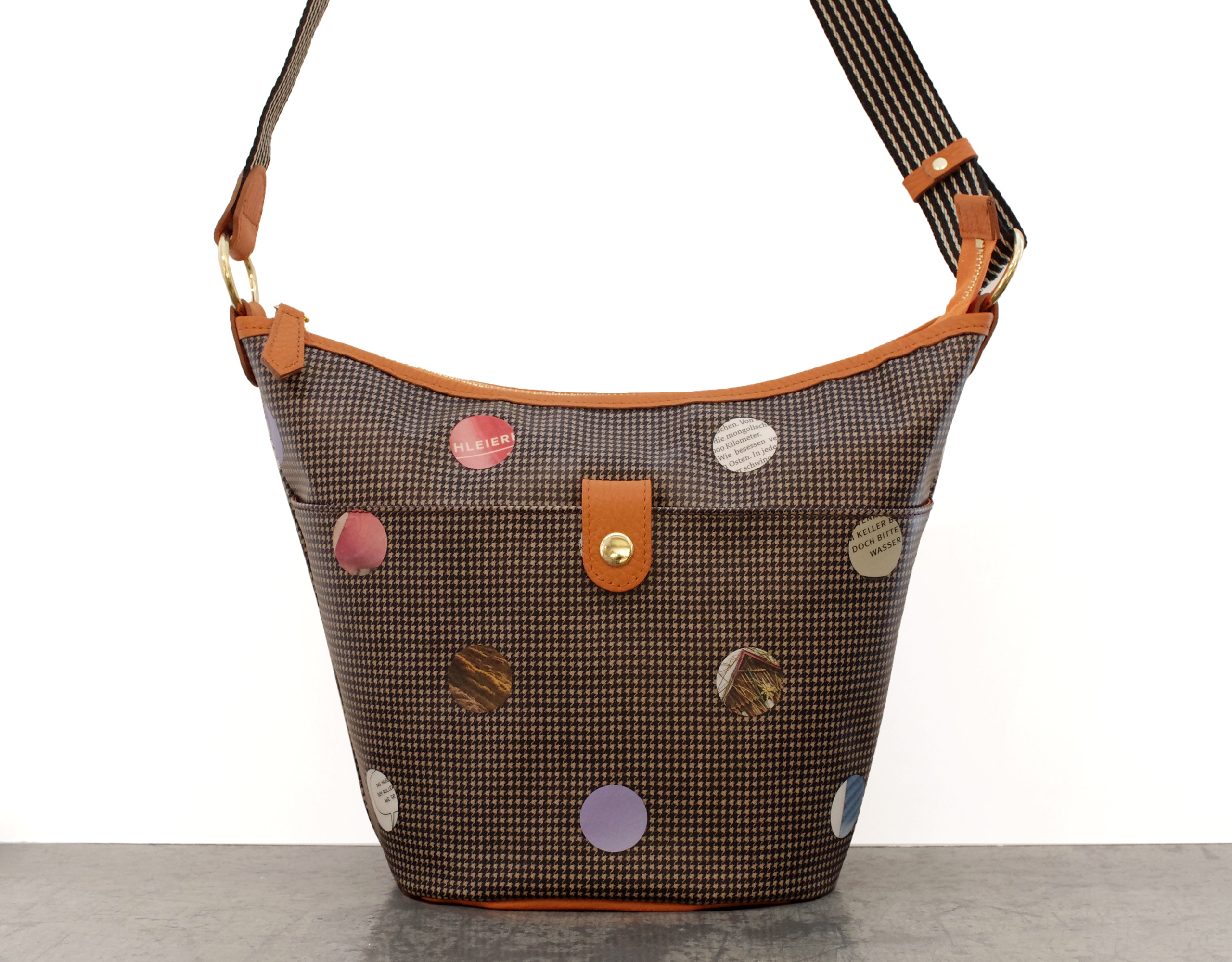 【世界に1つだけのポシェット】 フランスの新聞やドイツの新聞などをドット柄に配した スーツ生地に 特別なプラスティックコーティングを施した小ぶりなバケツ型ポシェットです 本物の新聞を使用しているので同じ柄は二つとありません プラスティックコーティングは雨にも強く また革のように使えば使うほど色が馴染みより雰囲気が増してきます パーツには牛革を使用しています 内側には大事なもの用のファスナー付ポケットとパスケースなどに使いやすいファスナーなしのポケットがついています 素材:牛革・リサイクルペーパー・ウール・綿 口幅 290mm、底幅 165mm、奥行 130mm、高さ 200mm、重さ 305g 日本製