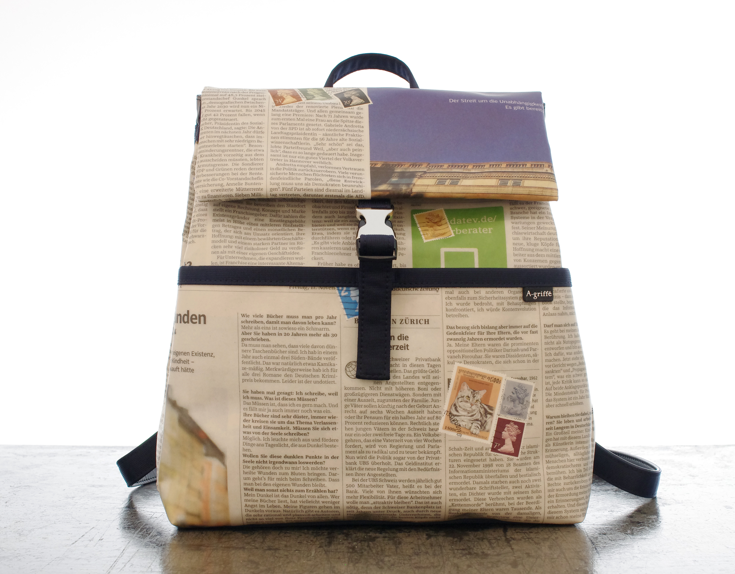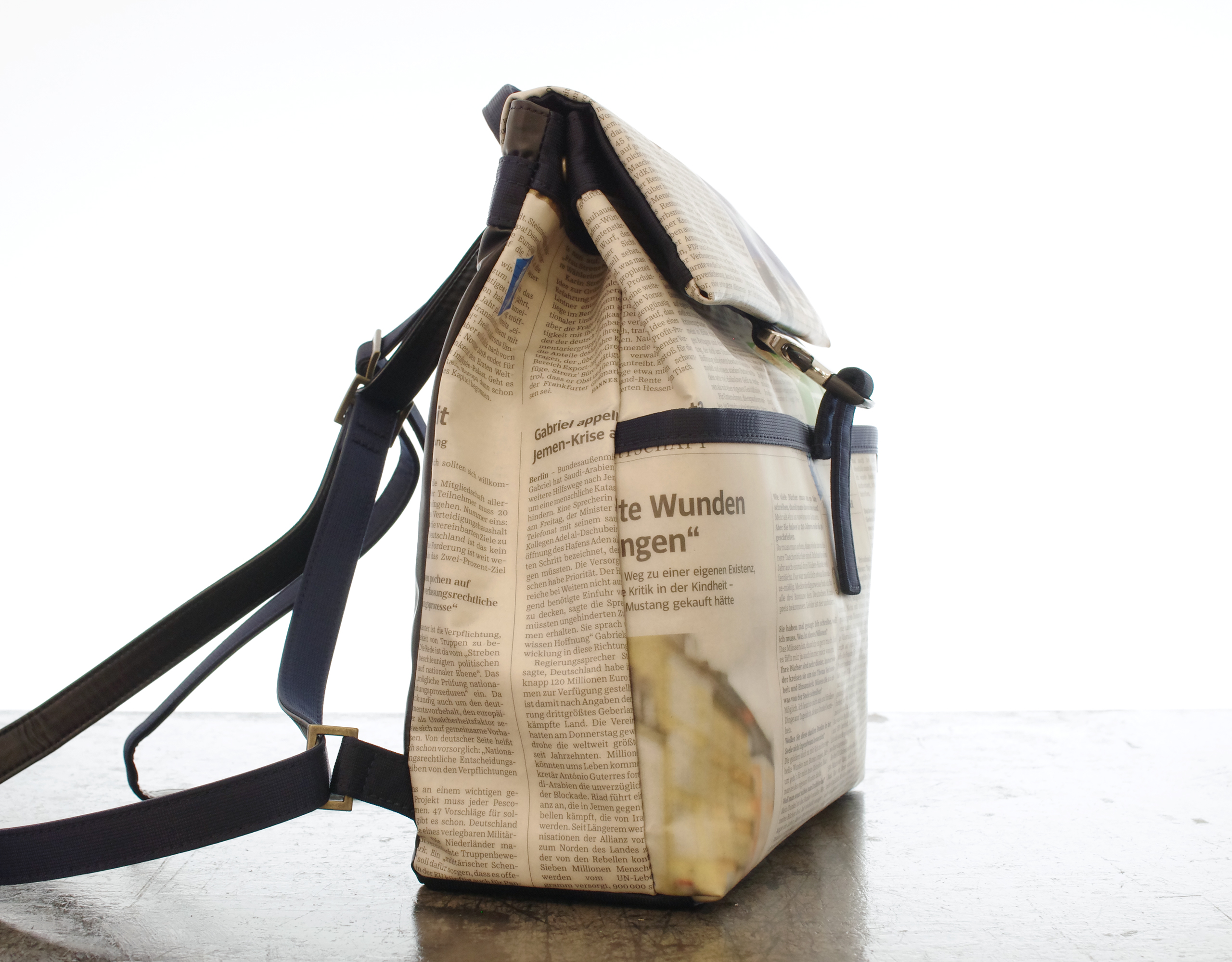 【世界に一つだけのトートバッグ】 ドイツ新聞柄 リサイクルペーパー トラペーズリュックサック ネイビー色 手作業で ドイツの新聞を特別なプラスティックコーティングしています. マチが薄型なので コンパクトに 普段使いにちょうど良いサイズです. でも 見た目以上にたっぷり収納していただけます. ボディは紙なので予想以上の軽さを実現しました. もちろん本物の新聞を使用しているので同じ柄は二つとありません. プラスティックコーティングは雨にも強く また 縫製は東京の職人が丁寧に縫っています. 素材:リサイクルペーパー×プラスチックコーティング・ナイロン・ポリウレタン・綿 底幅 255mm、奥行 105mm、高さ 280mm、重さ 400g 日本製