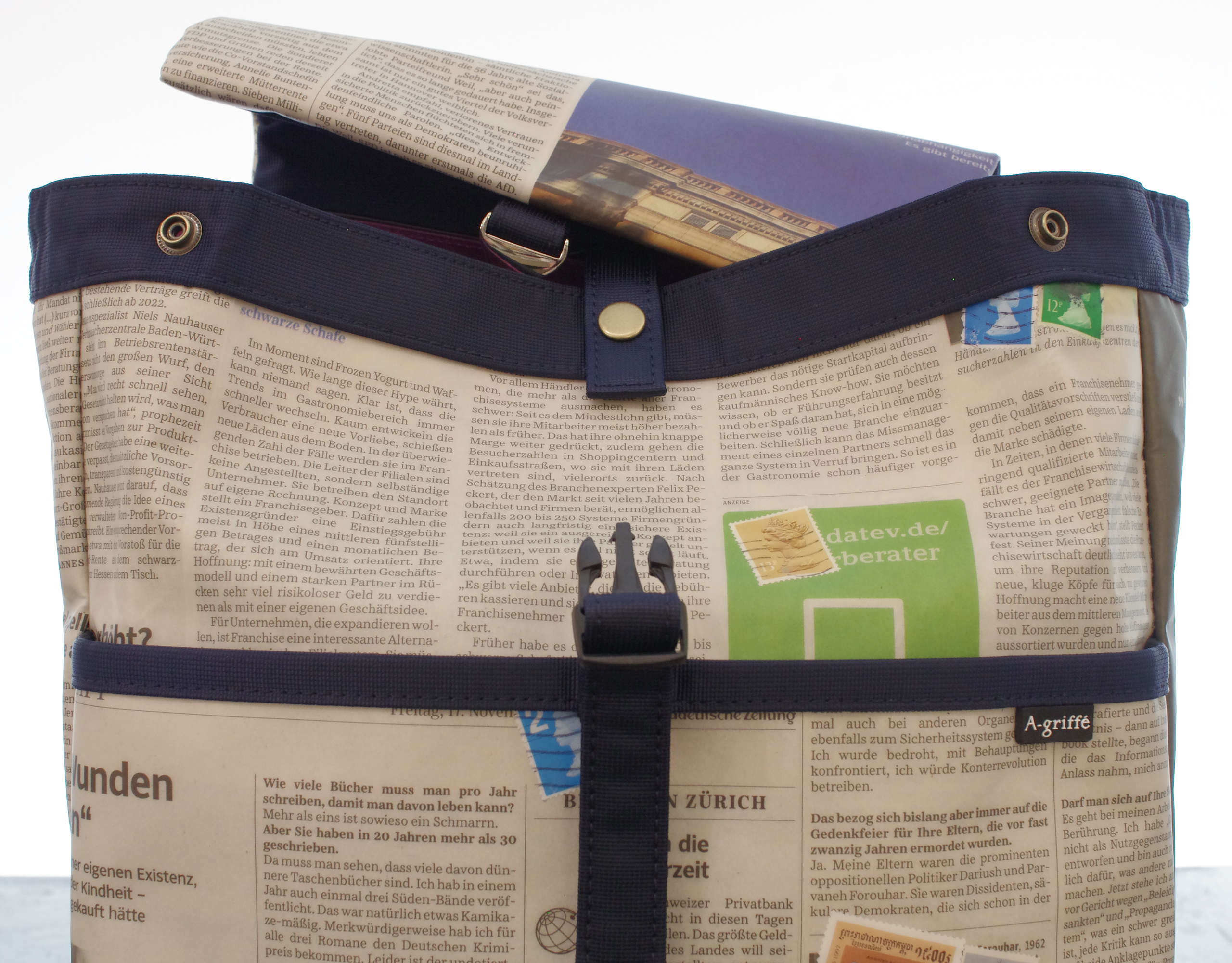 | 製品名 | ドイツ新聞柄 トラペーズリュックサック ネイビー色 14 |