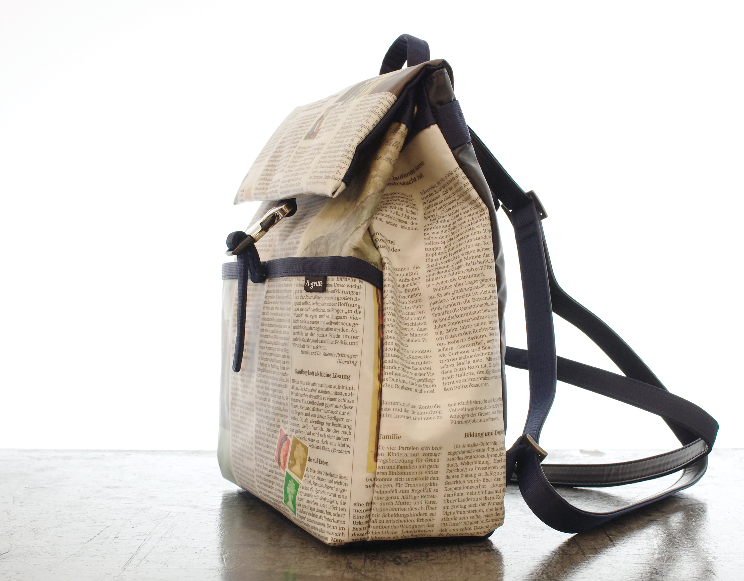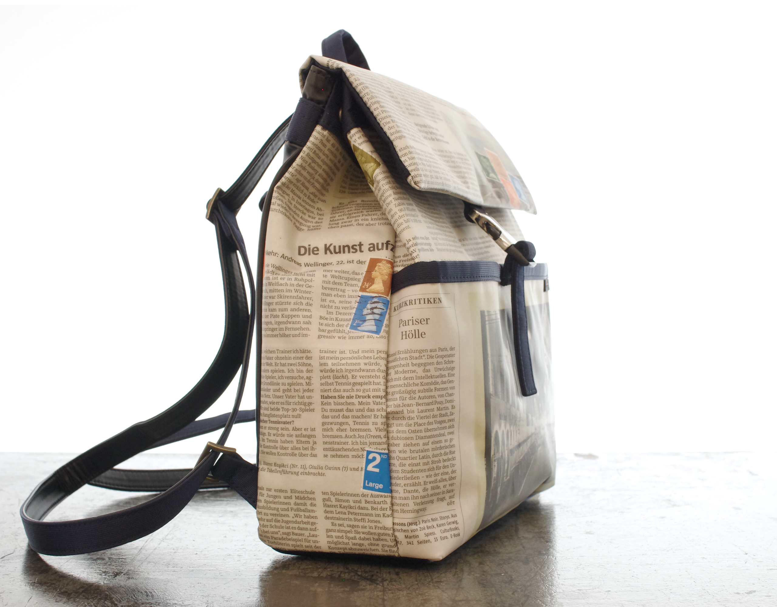 【世界に一つだけのトートバッグ】 ドイツ新聞柄 リサイクルペーパー トラペーズリュックサック ネイビー色 手作業で ドイツの新聞を特別なプラスティックコーティングしています. マチが薄型なので コンパクトに 普段使いにちょうど良いサイズです. でも 見た目以上にたっぷり収納していただけます. ボディは紙なので予想以上の軽さを実現しました. もちろん本物の新聞を使用しているので同じ柄は二つとありません. プラスティックコーティングは雨にも強く また 縫製は東京の職人が丁寧に縫っています. 素材:リサイクルペーパー×プラスチックコーティング・ナイロン・ポリウレタン・綿 底幅 255mm、奥行 105mm、高さ 280mm、重さ 400g 日本製