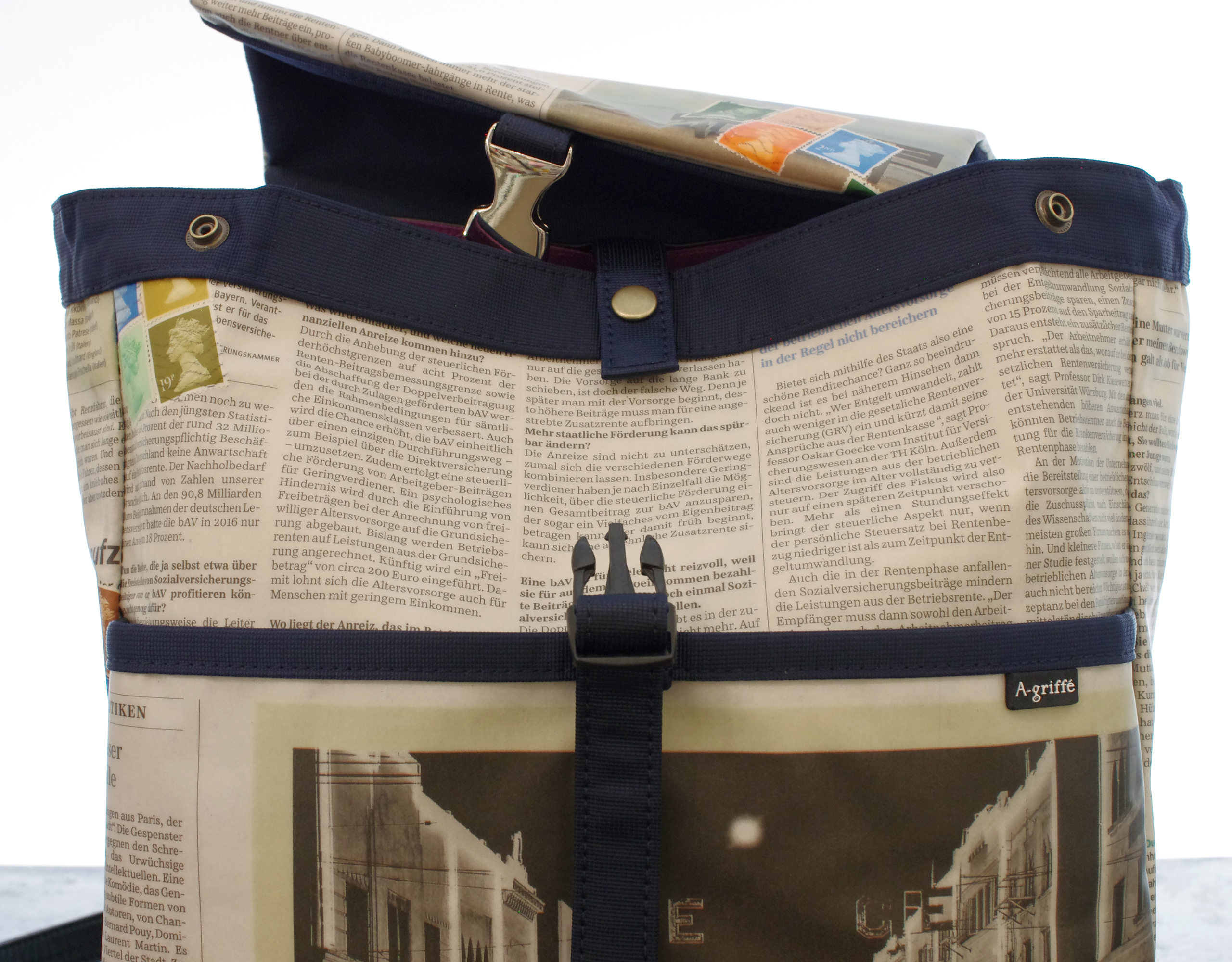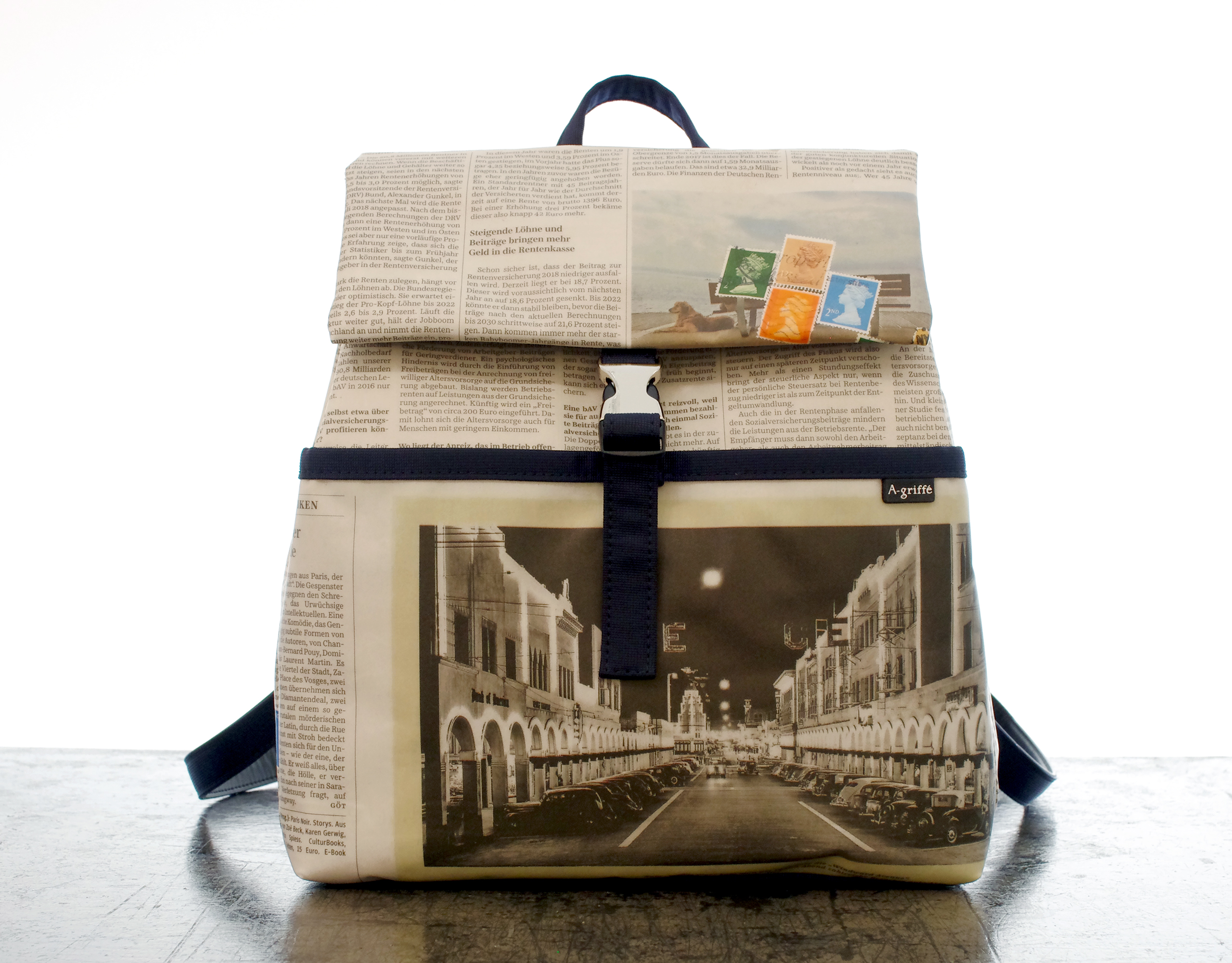 | 製品名 | ドイツ新聞柄 トラペーズリュックサック ネイビー色 16 |