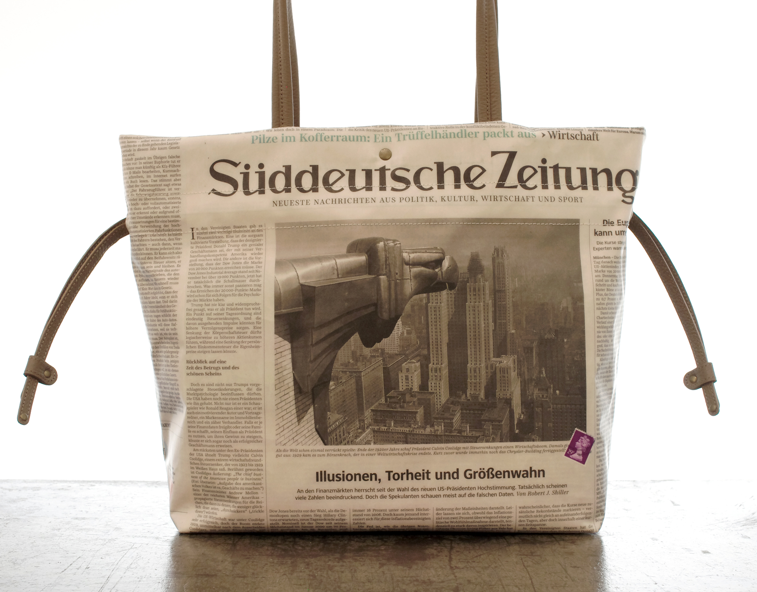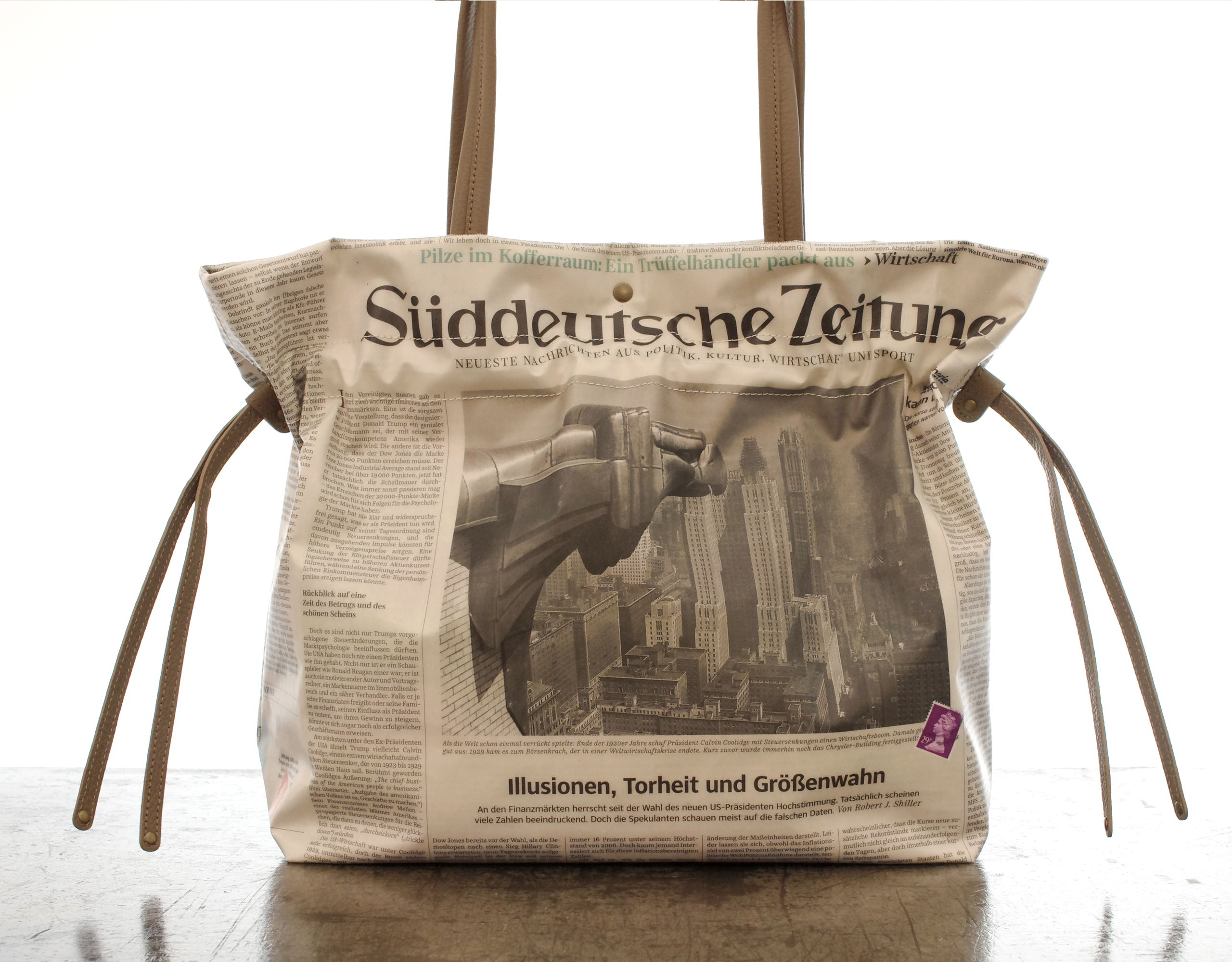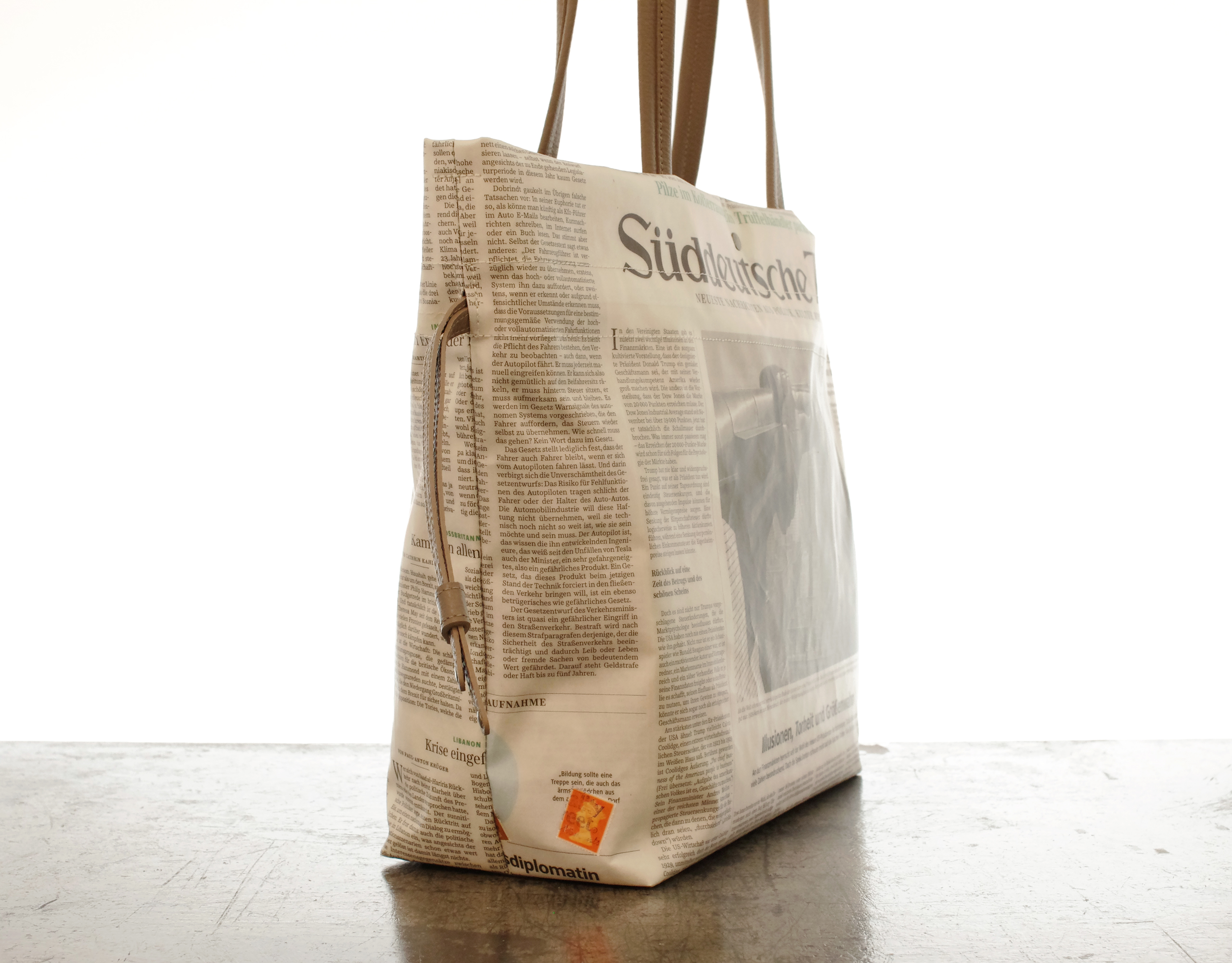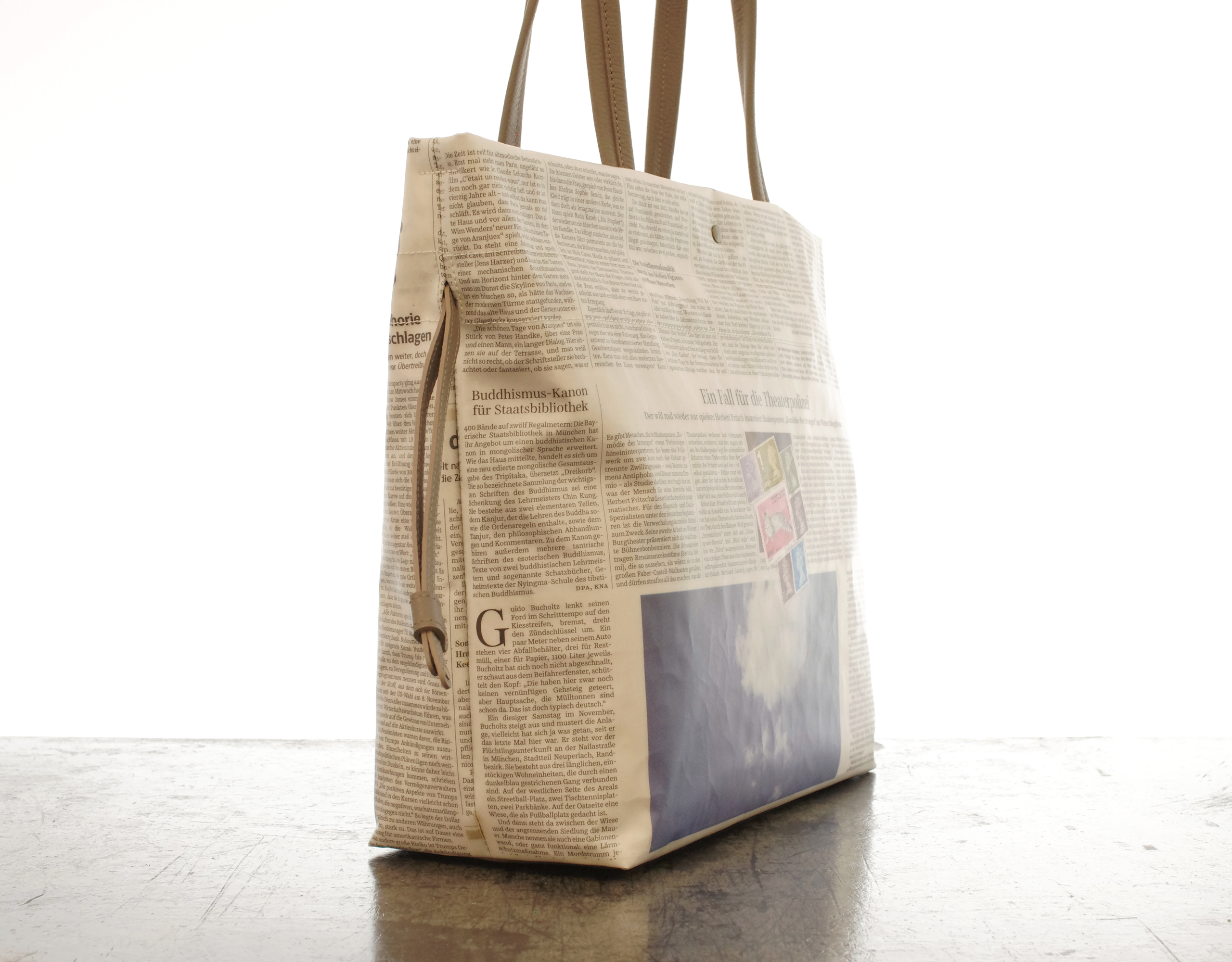 【世界に一つだけのトートバッグ】 ドイツ新聞柄 2way巾着トート ドイツの新聞を柿渋などで手染めしてからシワ加工を施し 特別なプラスティックコーティングを手作業で施しています. ですので最初から少し使い込んだようないい雰囲気で持っていただけます. サイズはA4のファイルが横にすっぽり収まるサイズです. 金具を最小限に使用していますので バッグ本体はとっても軽くできています. もちろん本物の新聞を使用しているので同じ柄は二つとありません. 内ポケットは 大事なもの用のファスナー付と 定期などを出し入れし易いファスナーなし が付いています. プラスティックコーティングは雨にも強く また 縫製は日本の職人が丁寧に縫っています. 素材:牛革・リサイクルペーパー×プラスチックコーティング・コットン 口幅 430mm、底幅 320mm、奥行 130mm、高さ 310mm、重さ 436g 日本製