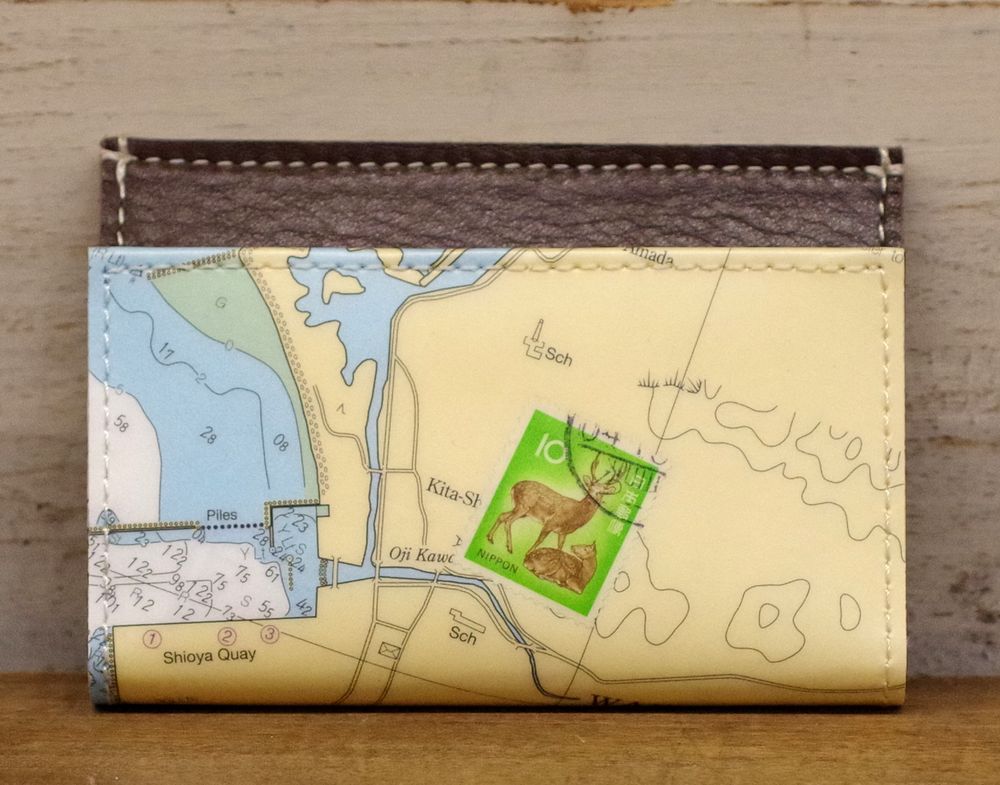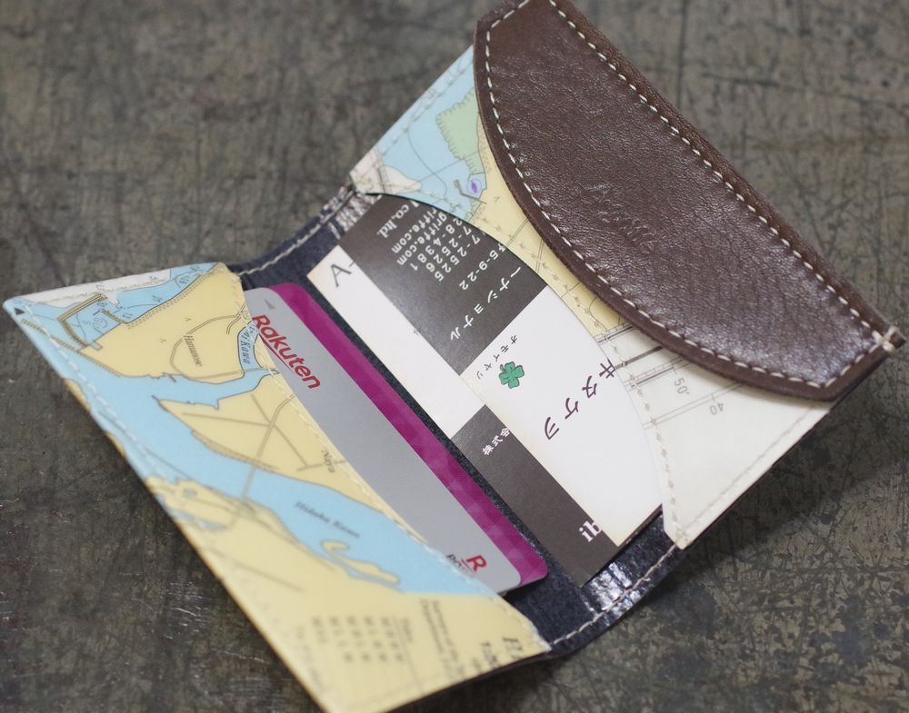 【世界に1つだけのカードケース】 外側は本物の英語版の日本の海図にプラスティックコーティングを施しています。 ふたの部分はタンニンとクロームのミックス鞣しを施したしっとりとしたチョコレートブラウン色の、シボの型押しを施した牛革です. 使うごとに味が出てくる牛革です 厚みにもよりますが 名刺で約30枚くらい入ります 沢山入れて使った方が型崩れ防止になります スイカやパスモを入れてもお使いいただけます プラスティックコーティングは革のように使えば使うほどいい感じに色が馴染んできます . 日本の職人が丁寧に縫い上げています. 表生地:ヴィンテージペーパー×プラスティックコーティング 裏生地:牛革、リサイクルペーパー 日本製
