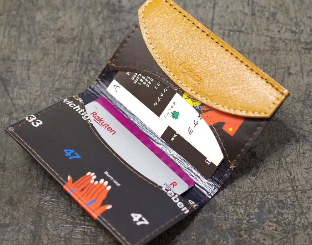 【世界に1つだけのカードケース】 外側は本物のドイツの雑誌に特別なプラスティックコーティングを施しています。 ふたの部分はタンニンとクロームのミックス鞣しを施したしっとりとしたキャメル色の、シボの型押しを施した牛革です. 使うごとに味が出てくる牛革です 厚みにもよりますが 名刺で約30枚くらい入ります 沢山入れて使った方が型崩れ防止になります スイカやパスモを入れてもお使いいただけます プラスティックコーティングは革のように使えば使うほどいい感じに色が馴染んできます . 日本の職人が丁寧に縫い上げています. 表生地:ヴィンテージペーパー×プラスティックコーティング 裏生地:牛革、リサイクルペーパー 日本製