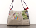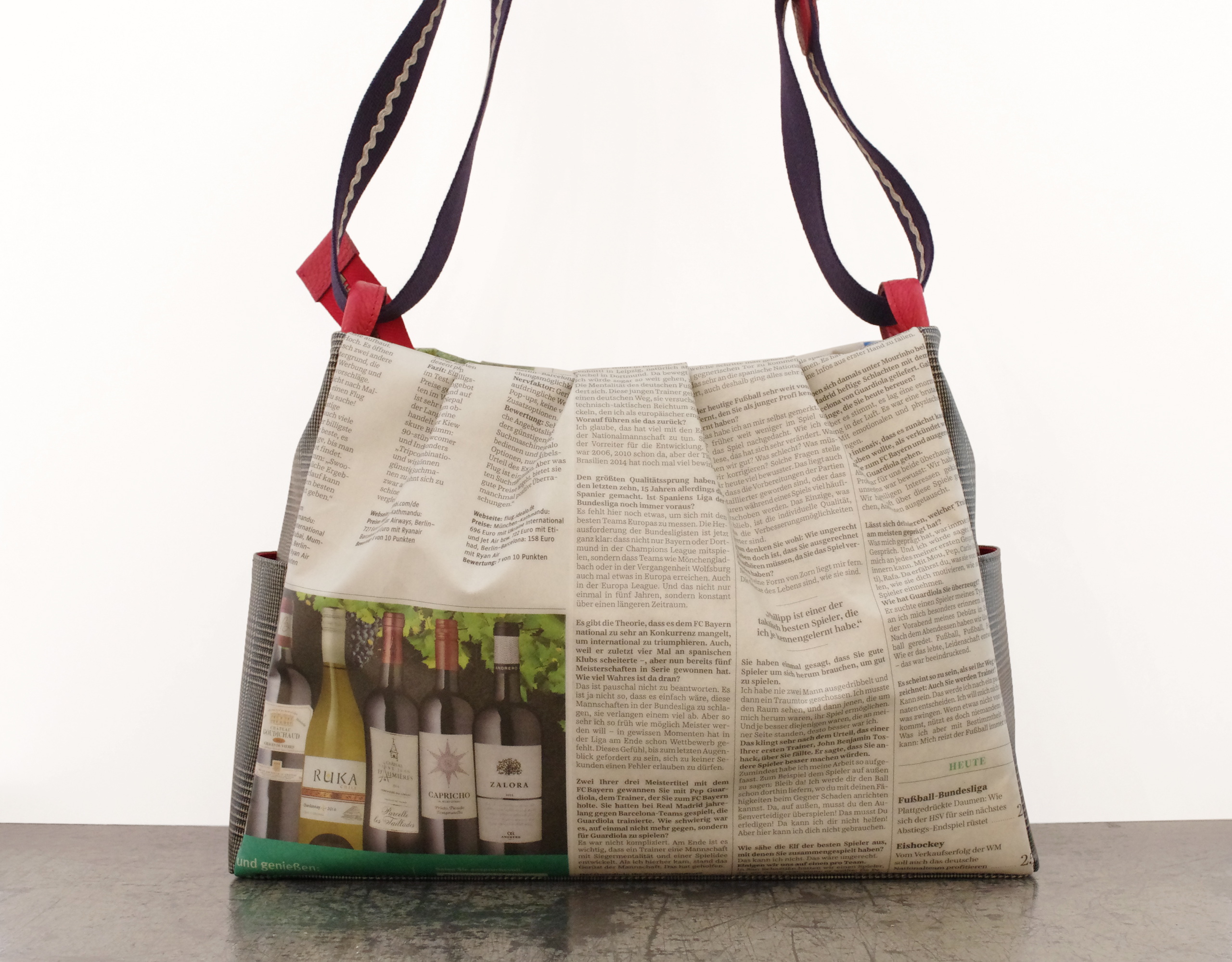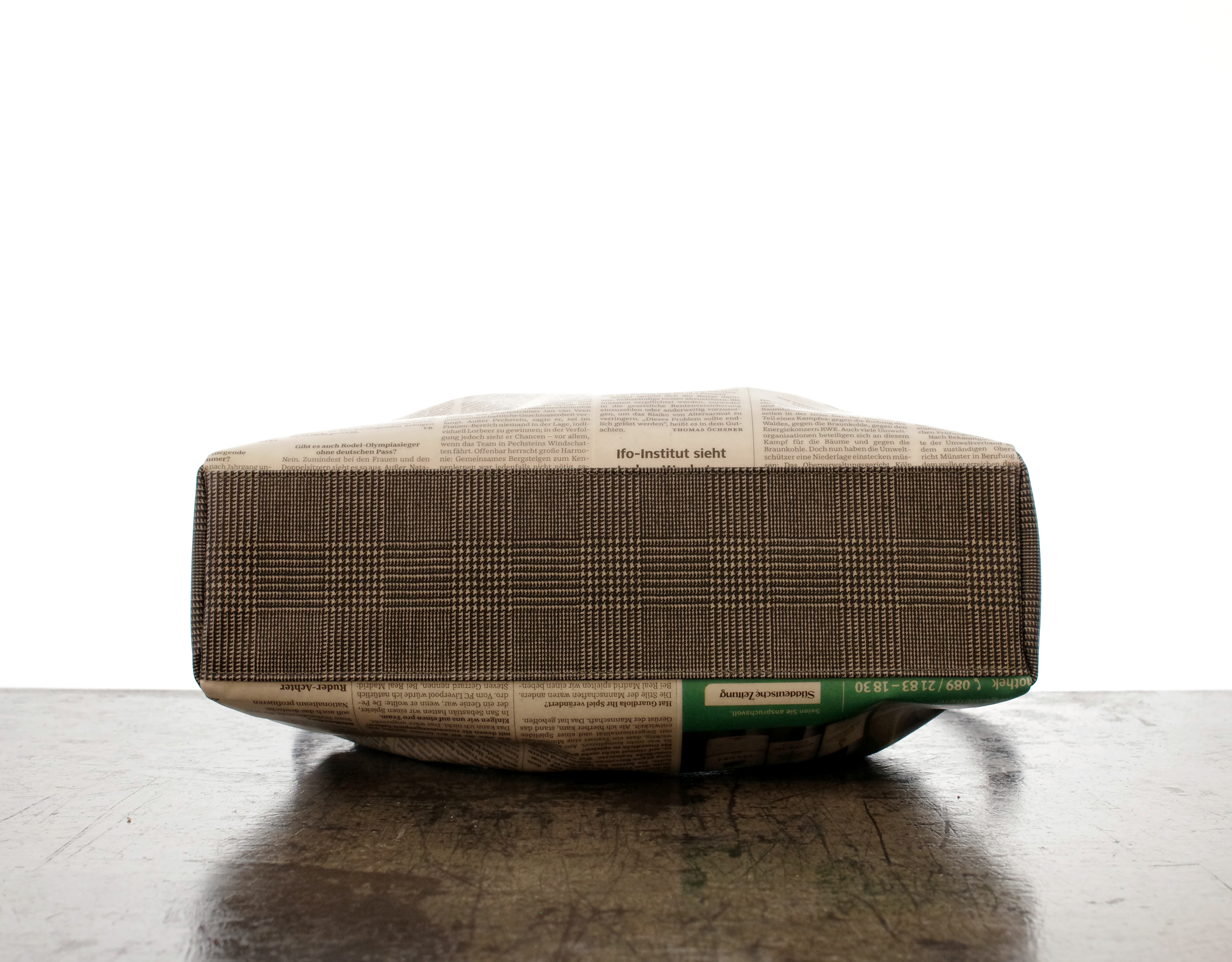 【世界に一つだけのショルダーバッグ】 ドイツ新聞柄 シェルポシェット ドイツの新聞をシワ加工を施し 特別なプラスティックコーティングを手作業で施しています. ですので最初から少し使い込んだようないい雰囲気で持っていただけます. サイズは iPadが収まるサイズです. タックが入っているので見た目以上にたくさん入ります. もちろん本物の新聞を使用しているので同じ柄は二つとありません. 内ポケットは 大事なもの用のファスナー付と 定期などを出し入れし易いファスナーなし が付いています. プラスティックコーティングは雨にも強く また 縫製は東京の職人が丁寧に縫っています. 素材:牛革・リサイクルペーパー×プラスチックコーティング・ウール・綿 口幅 225mm、底幅 310mm、奥行 90mm、高さ 215mm、重さ 本体 350g 日本製