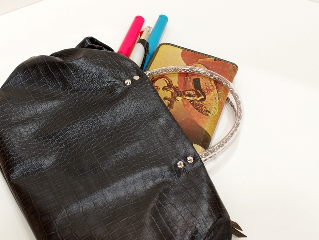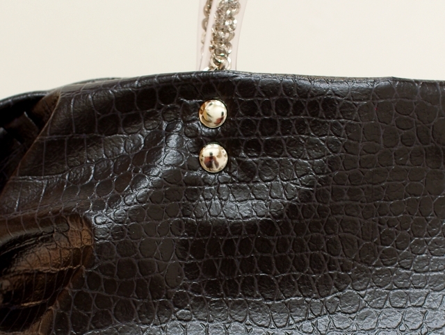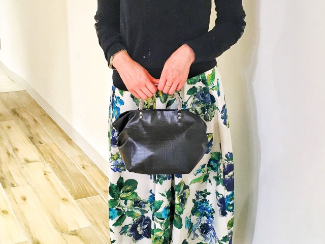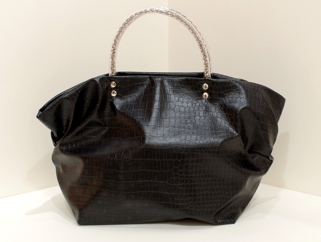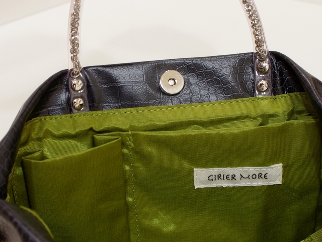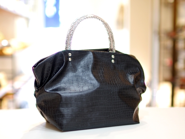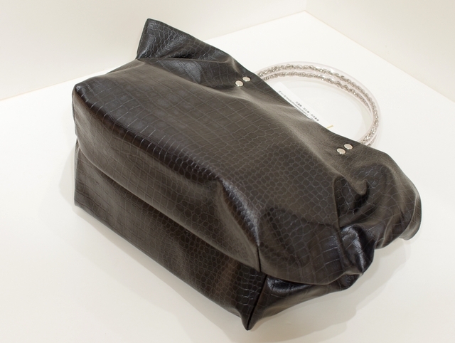素材はハイブリッド合皮と呼ばれるしっとりとしたペタペタしない冬場に堅くなったりしない見た目はまるで革のようなしなやかさを持った新しい合皮です。柄はクロコダイルの型押しのブラック色で一年を通じてお使いになれる色です。内側には携帯用と、パスケース用のパッチポケット付。裏地は暗いところでも見やすいように明るい色を付けています。口にはマグネット付で裾のマチを深めにとっていますのでお弁当箱を横にせずに収まります。サイドにはゴムシャーリングが入っていてちょっといい雰囲気です。手元のチェーンはキラキラ動きますので上品に光ります。日本の職人がミシンを踏んで縫っている当社の定番中の定番です。お手入れはお台所用の中性洗剤を薄めて汚れを叩くようにして下さい。 口幅 25センチ、底幅 17センチ、奥行 13センチ、高さ 17.5センチ、持ち手の高さ 6.5センチ、重さ 150グラム、 日本製