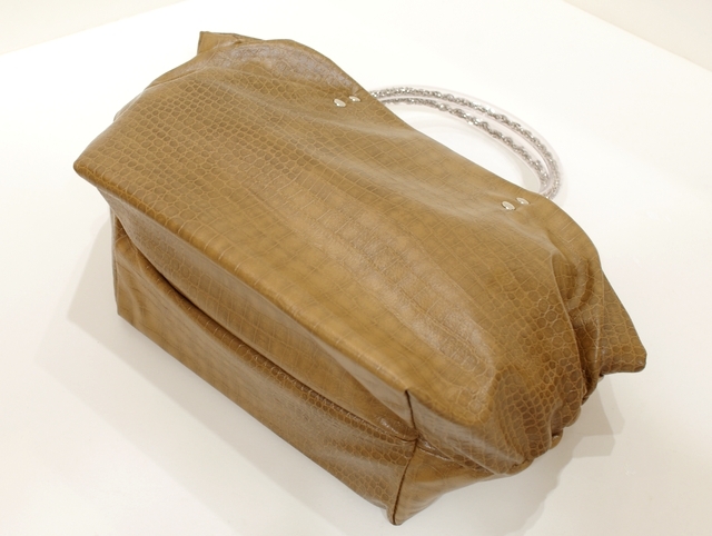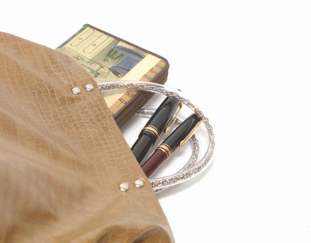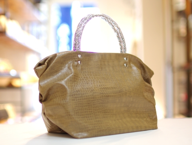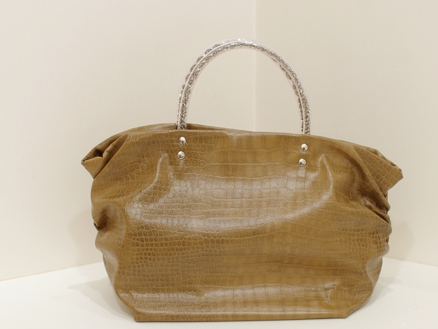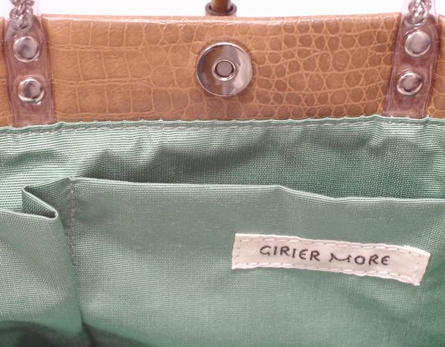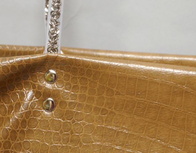 そざいはハイブリッド合皮と呼ばれるしっとりとしたペタペタしない冬場に堅くなったりしない見た目はまるで革のようなしなやかさを持った新しい合皮です。柄はクロコダイルの型押しのキャメル色で一年を通じてお使いになれる色です。内側には携帯用と、パスケース用のパッチポケット付。裏地は暗いところでも見やすいように明るい色を付けています。口にはマグネット付で裾のマチを深めにとっていますのでお弁当箱を横にせずに収まります。サイドにはゴムシャーリングが入っていてちょっといい雰囲気です。手元のチェーンはキラキラ動きますので上品に光ります。日本の職人がミシンを踏んで縫っている当社の定番中の定番です。お手入れはお台所用の中性洗剤を薄めて汚れを叩くようにして下さい。 口幅 25センチ、底幅 17センチ、奥行 13センチ、高さ 17.5センチ、持ち手の高さ 6.5センチ、重さ 150グラム、 日本製