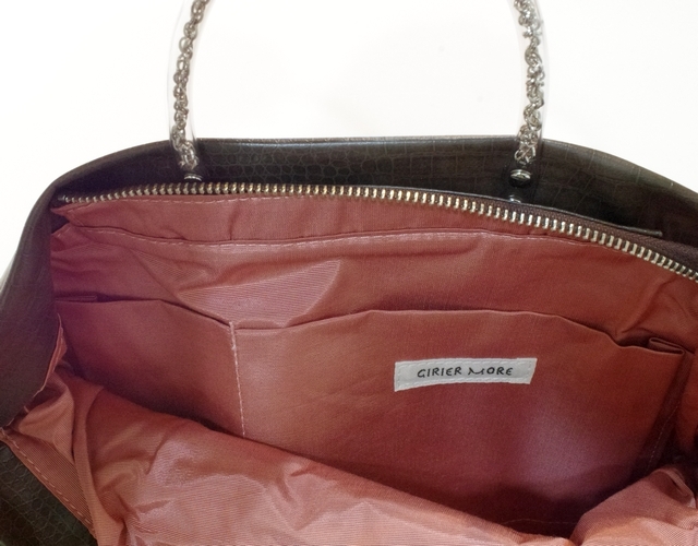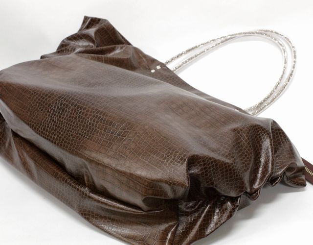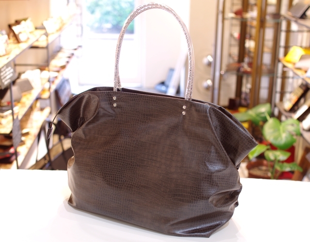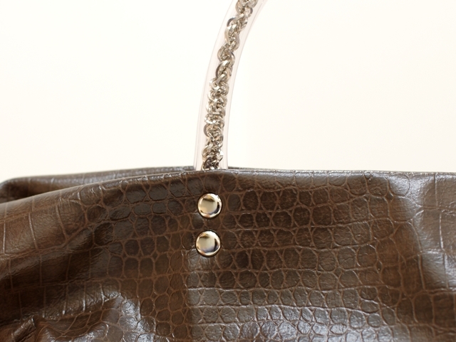 【超軽量チェーントートバッグ】軽く、雨に強い撥水、シワになりにくい がコンセプトの超軽量トートバッグです。素材はハイブリッド合皮と呼ばれるしっとりとしたペタペタしない冬場に堅くなったりしない見た目はまるで革のようなしなやかさを持った新しい合皮です。柄はクロコダイルの型押しのチョコレートブラウン色で深みがあります。内側には携帯用と、パスケース用のパッチポケット付。裏地は暗いところでも見やすいように明るい色を付けています。口はファスナー付でファスナー脇の両サイドに少し隙間を持たせています。これはファスナーを開けずにペットボトルや折り傘などができるようにの配慮です。また裾のマチを深めにとっていますのでちょっと荷物が増えた時でも見た目以上に入ります。サイドにはゴムシャーリングが入っていてちょっといい雰囲気です。肩にかけられるので荷物が増えても安心です。手元のチェーンはキラキラ動きますので上品に光ります。日本の職人がミシンを踏んで縫っている当社の定番中の定番です。 口幅 25センチ、底幅 17センチ、奥行 13センチ、高さ 17.5センチ、持ち手の高さ 6.5センチ、重さ 150グラム、 日本製