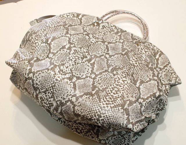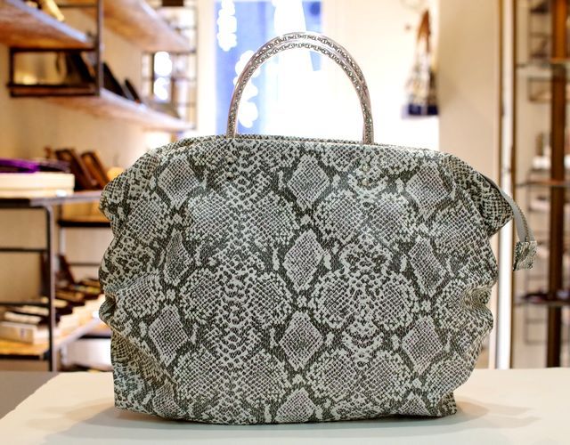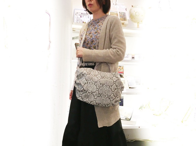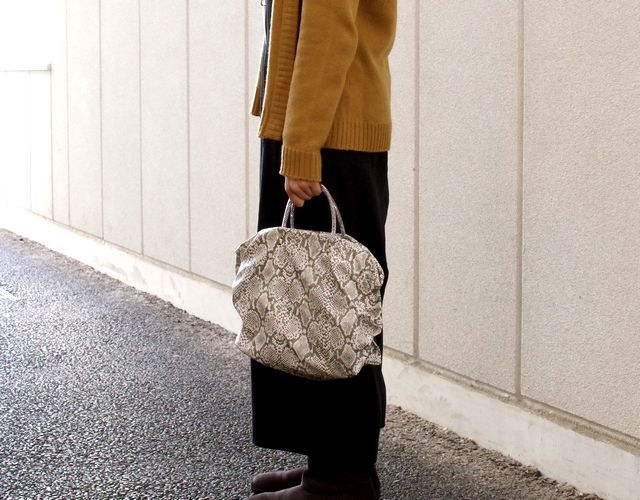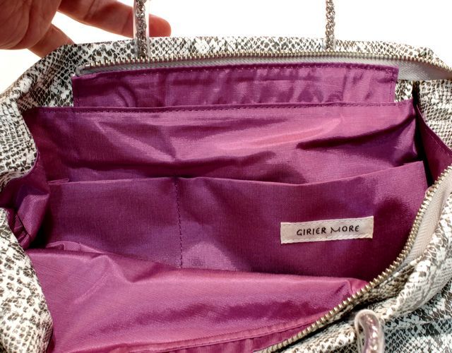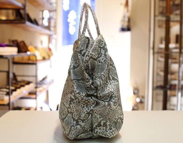 【超軽量チェーントートバッグ】 軽く、雨に強い撥水、シワになりにくい がコンセプトの超軽量トートバッグです。 素材は型押しを施したパイソン柄の合皮です。このパイソン柄はプリントだけでなく型押しをしているので凹凸があり、マットにしっとりとした手ざわりを実現しています。日本製の合皮は従来の合皮と違い、冬場硬くなったり、ベタベタしたりしにくい加工になっています。またとっても軽いのも魅力の一つです。パープルピンク色の裏地との相性もばっちりです。 内側には携帯用と、パスケース用のパッチポケット付。 裏地は暗いところでも見やすいように明るい色を付けています。 口はファスナー付でファスナー脇の両サイドに少し隙間を持たせています。これはファスナーを開けずにペットボトルや折り傘などができるようにの配慮です。また裾のマチを深めにとっていますのでちょっと荷物が増えた時でも見た目以上に入ります。サイドにはゴムシャーリングが入っていてちょっといい雰囲気です。 手元のチェーンはキラキラ動きますので上品に光ります。 日本の職人がミシンを踏んで縫っている当社の定番中の定番です。お手入れはお台所用の中性洗剤を薄めて汚れを叩くようにして下さい。 口幅 32センチ、底幅 27センチ、奥行 13センチ、高さ 25センチ、持ち手の高さ 8センチ、重さ 310グラム、ショルダー紐の長さ 69~129センチ、 日本製