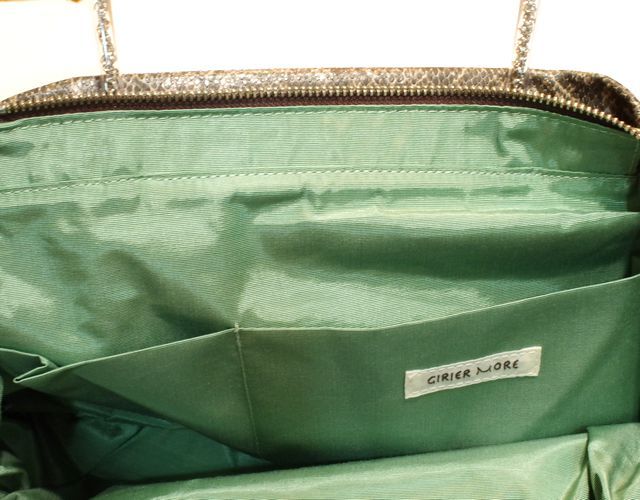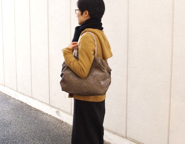【超軽量チェーントートバッグ】 軽く、雨に強い撥水、シワになりにくい がコンセプトの超軽量トートバッグです。 素材は型押しを施したパイソン柄の合皮です。このパイソン柄はプリントだけでなく型押しをしているので凹凸があり、マットにしっとりとした手ざわりを実現しています。日本製の合皮は従来の合皮と違い、冬場硬くなったり、ベタベタしたりしにくい加工になっています。またとっても軽いのも魅力の一つです。パープルピンク色の裏地との相性もばっちりです。 内側には携帯用と、パスケース用のパッチポケット付。 裏地は暗いところでも見やすいように明るい色を付けています。 口はファスナー付でファスナー脇の両サイドに少し隙間を持たせています。これはファスナーを開けずにペットボトルや折り傘などができるようにの配慮です。また裾のマチを深めにとっていますのでちょっと荷物が増えた時でも見た目以上に入ります。サイドにはゴムシャーリングが入っていてちょっといい雰囲気です。 手元のチェーンはキラキラ動きますので上品に光ります。 日本の職人がミシンを踏んで縫っている当社の定番中の定番です。お手入れはお台所用の中性洗剤を薄めて汚れを叩くようにして下さい。 口幅 42センチ、底幅 32センチ、奥行 15センチ、高さ 29センチ、持ち手の高さ 19センチ、重さ 330グラム、 日本製