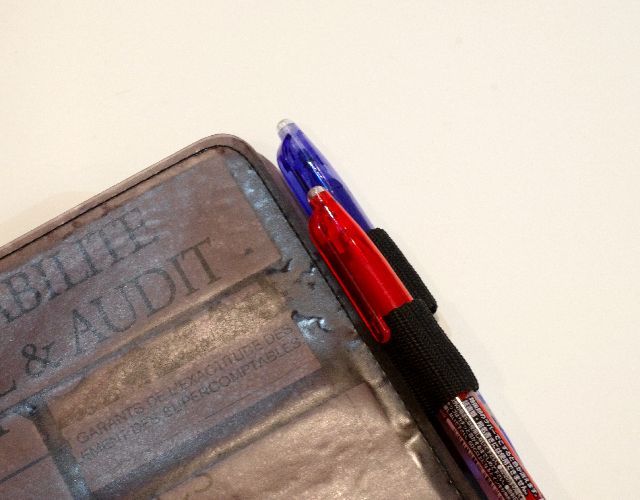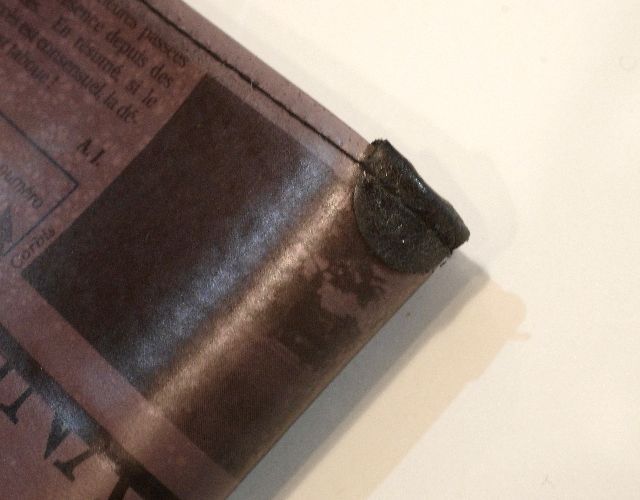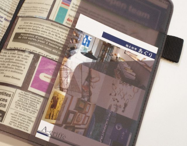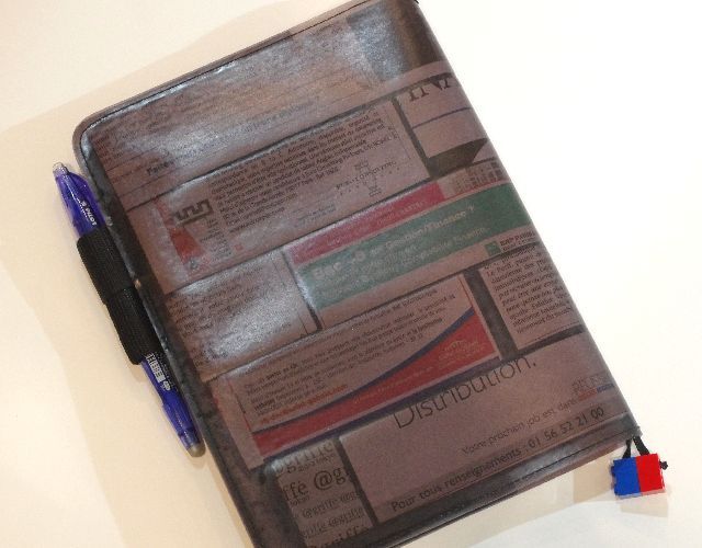 .外側は特別なプラスティックコーティングを施したフランスの新聞をパッチワ-クしたものです。本物の新聞を使用しているので同じ柄は二つとありません。内側PVCでコーティングしています。見出し用の紐を2本付けています。先端はレゴブロックを使用しています。左側にカードが三枚。右側はポストカードなどを挟めるように。ペンホルダーは2本用付けていますが、1本の通し刺しにすると鞄の中で開かないようロックになります。コーティングは特殊な素材を手作業でしているので革のように経年変化のエージングが楽しめます。日本の職人が丁寧に縫っています。