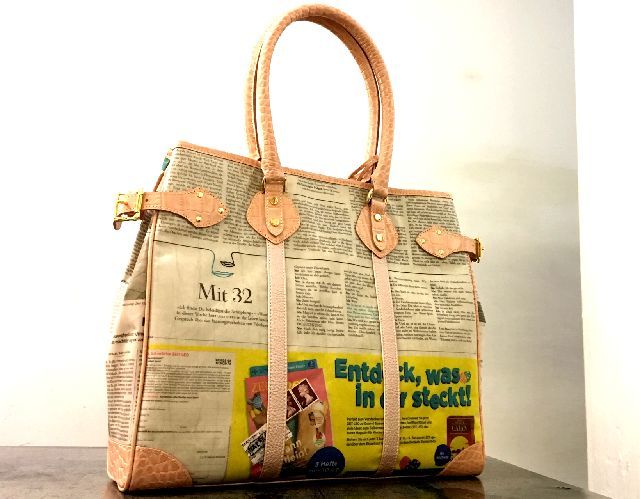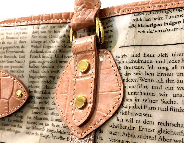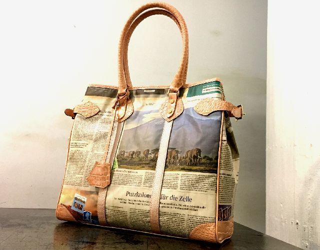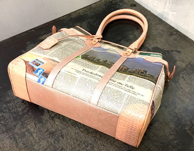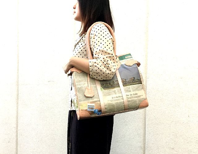フランスの新聞とドイツの新聞をを柿渋などで手染めしてからシワ加工を施し、特別なプラスティックコーティングを手作業で施しています。ですので最初から少し使い込んだようないい雰囲気で持っていただけます。プラスティックのコーティングは雨にも強いです。サイズはA4のファイルが横にすっぽり収まるサイズで仕事などにもお使いいただいております。ところどころを牛革で補強してあるので丈夫ですしボディは紙なので予想以上の軽さを実現しました。もちろん本物の新聞を使用しているので同じ柄は二つとありません。内ポケットは両側に、大事なもの用のファスナー付と定期などを出し入れし易いファスナーなしとです。プラスティックコーティングは雨にも強くまた、縫製は東京の職人が丁寧に縫っています。