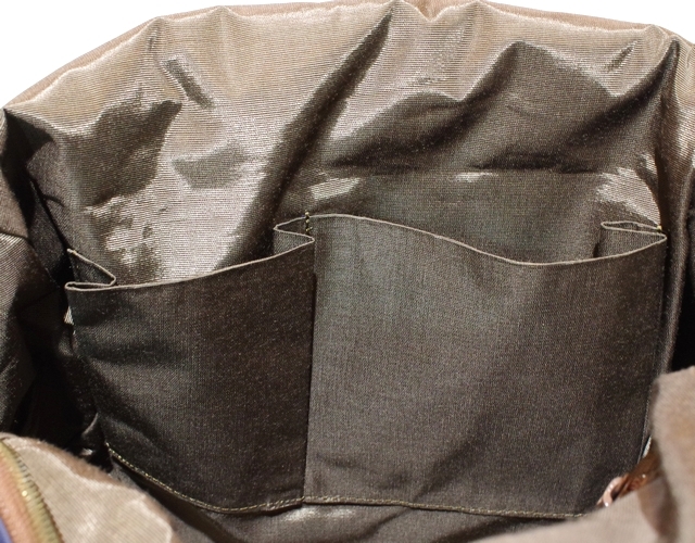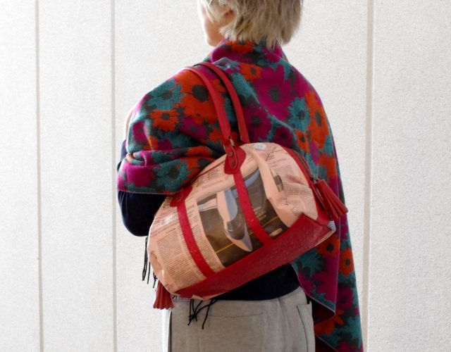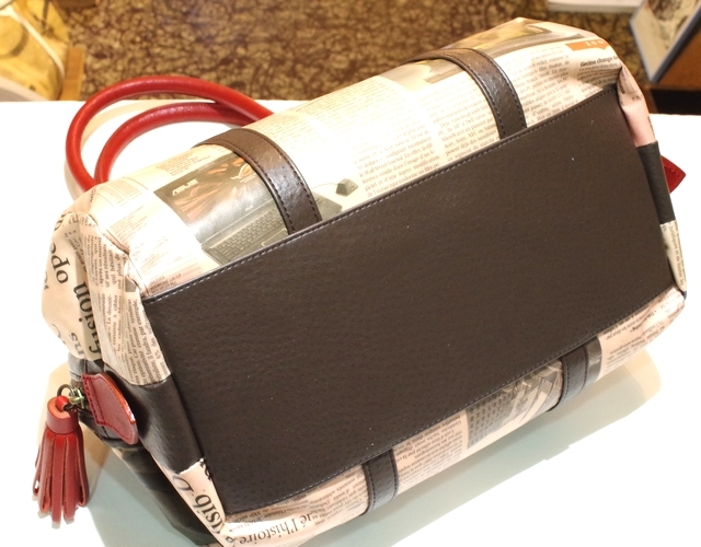 フランス、ドイツの新聞を柿渋などで手染めしてからシワ加工を施し、特別なプラスティックコーティングを手作業で施しています。ですので最初から少し使い込んだようないい雰囲気で持っていただけます。この柄は別注色でイタリアをイメージさせるスカーレットレッドの色合いです。年間を通してお持ちいただける人気の色目です。モノをたくさん入れると丸くなり、あまり入れないと横長のとても不思議な形です。ワンちゃんの耳のようにタッセルが両サイドにあり、どちらからでもファスナーを開くことができるスグレモノです。ところどころを牛革であしらってあるので丈夫ですしボディは紙なので予想以上の軽さを実現しました。もちろん本物の新聞を使用しているので同じ柄は二つとありません。内ポケットは両側に、大事なもの用のファスナー付と定期などを出し入れし易いファスナーなしとです。プラスティックコーティングは雨にも強くまた、縫製は東京の職人が丁寧に縫っています。