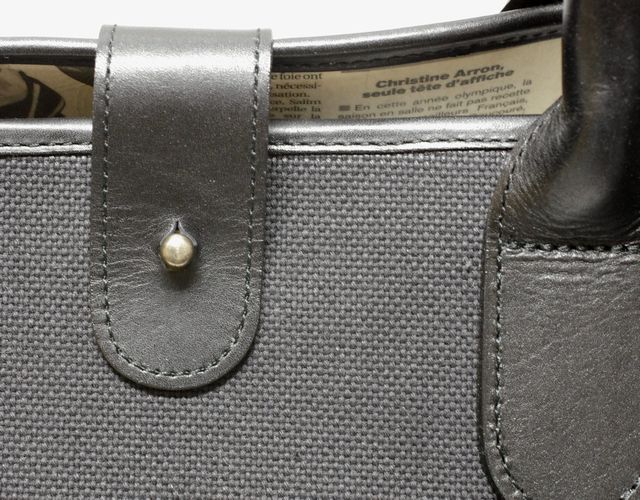 表生地はタテ糸10番手糸の6本撚×ヨコ糸10番手糸の5本撚という4号帆布用のスペックをさらにオリジナルコーティングしているので他では見られないしっかりした風合いの生地です。使い込んでいったときにいい風合いになるよう設計しています。スーツ、ジャケットスタイルで少し外した感じでも持てるようにデザインしています。そしてコーティングしたフランスのニュースペーパーで取り外し可能のポーチをお付けしています。ちょっとした大事なものを入れておくのに便利です。持ち手とトリミング、底の部分は牛革です。口元は牛革で巻いています。口が開かないよう革タブ+アンティークゴールドのギボシを付けています。男らしいデザインを強調しています。サイドに名刺入れなどが入れられるポケットをアンティーク加工したフランスの新聞をさらにプラスティックコーティングした素材で作っています。内ポケットは両側に型押しの牛革でトリミングしたファスナー付をつけています。その上にパスケースなどが入れられる牛革のパッチポケットを縫いつけています。ファスナーはシルバーのコイルファスナーという軽くて美しいファスナーにしています。外側から少しだけ覗くように見返しの上側をコーティングしたフランスの新聞を使っています。底にはアンティークゴールドの底鋲を5つ打ちつけて保護しています。
