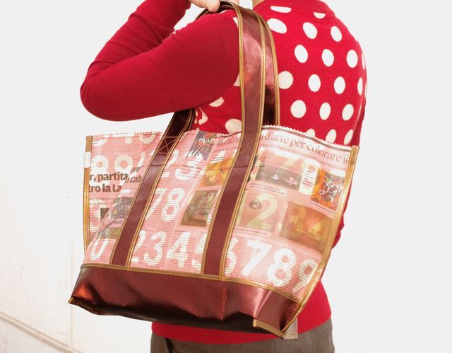 【世界に1つだけのトートバッグ】 イタリアの新聞にペイントを施してから特別なプラスティックコーティングを手作業で施しました。イタリアの新聞のカラフルさとメタリック素材が絶妙なハーモニーを醸し出しています。本物の新聞を使用しているので同じ柄は二つとありません。プラスティックコーティングは雨にも強く、また革のように経年変化による色の変化が楽しめます。ベースが紙なのでとても軽いです。内側には少し大ぶりのポケットがついています。またバッグの口にはスナップ付のタブで止められる仕様にしています。日本製です。【柄について】片面は田舎の雰囲気のある古い家屋の写真と文字、もう片面はアートの写真とサッカーのセリエAですね。持ち手素材:牛革 表生地:ヴィンテージペーパー×プラスティックコーティング 裏生地:綿 日本製