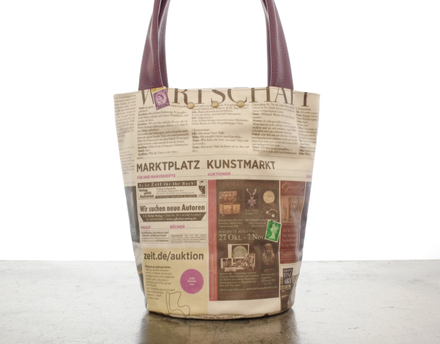 【世界に一つだけのトートバッグ】ドイツ新聞紙 バケツ型トート 持ち手 牛革 モーヴパープル色 02