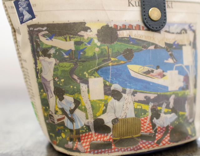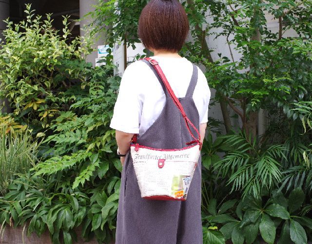 フランスの新聞やドイツの新聞などを特別なプラスティックコーティングを施した小ぶりなショルダーバッグです
