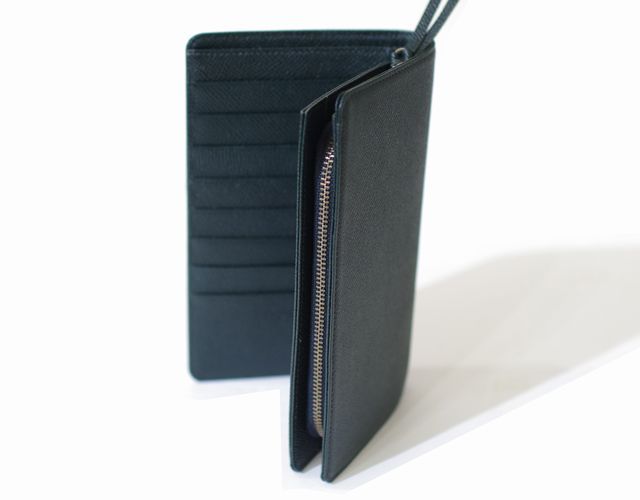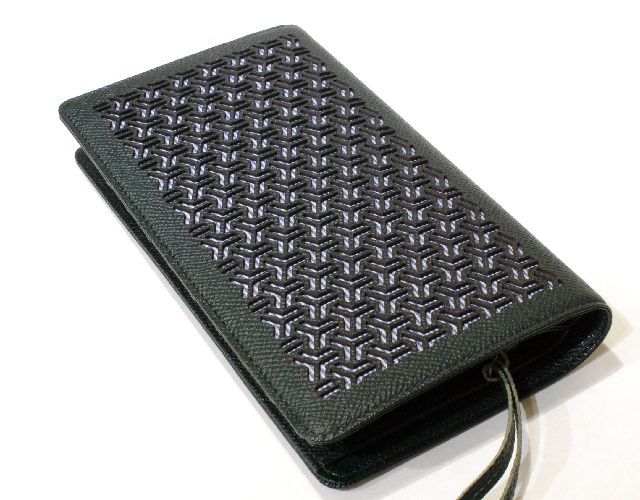 【牛革彫刻 長財布】 特別になめし、シボの型押しをした牛革に彫刻を施しています。日本古来の吉祥文様の組亀甲柄。その下側に英国の伝統柄のロンドンストライプをあしらっています。手作業の工程をいくつも経て出来上がったその特別な深い彫刻は見る角度でその表情を変えます。日本の伝統柄と英国の伝統柄の出会いは、チョークストライプのスーツから和服までコーディネイトを選びません。 ブランドを卒業された大人のかたへおつくりしました。また小銭の出し入れのしやすいファスナー形状、お札が顔をのぞかせることのない深めの上品な札入れ部分、とおつくりも工夫してあります。表生地:牛革型押し(ブリティシュグリーン色) 内側生地:レーヨン 東京職人謹製