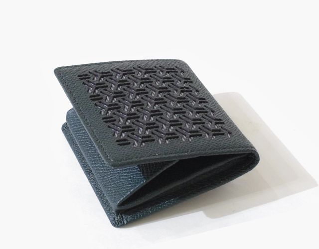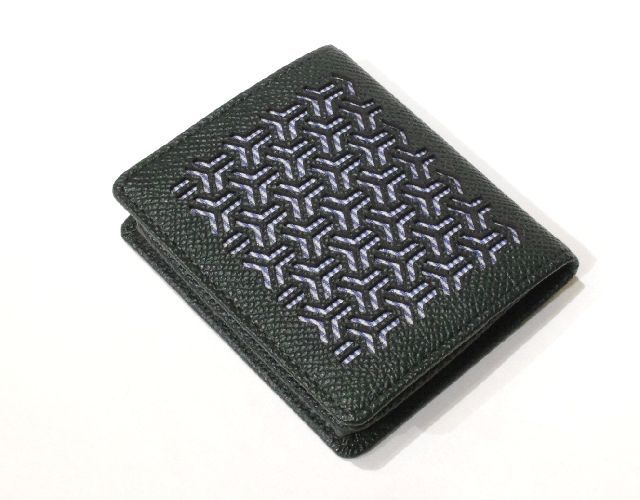 【牛革彫刻 小銭入れ】 特別になめし、シボの型押しをした牛革に彫刻を施しています。日本古来の吉祥文様の組亀甲柄。その下側に英国の伝統柄のロンドンストライプをあしらっています。手作業の工程をいくつも経て出来上がったその特別な深い彫刻は見る角度でその表情を変えます。日本の伝統柄と英国の伝統柄の出会いは、チョークストライプのスーツから和服までコーディネイトを選びません。 ブランドを卒業された大人のかたへおつくりしました。ちょっとした時に品性を感じさせる、さりげない小物になりました。表生地:牛革型押し(ブリティシュグリーン色) 内側生地:レーヨン 東京職人謹製