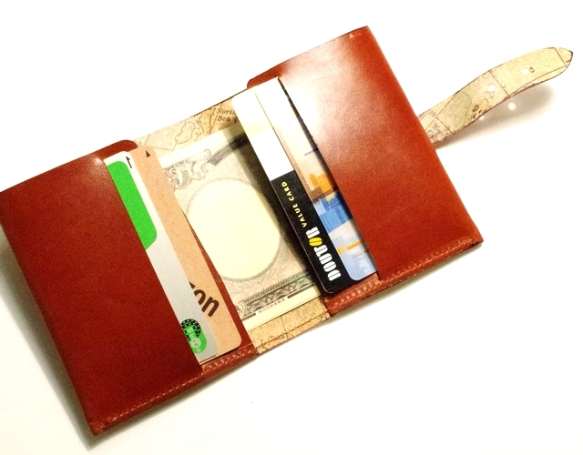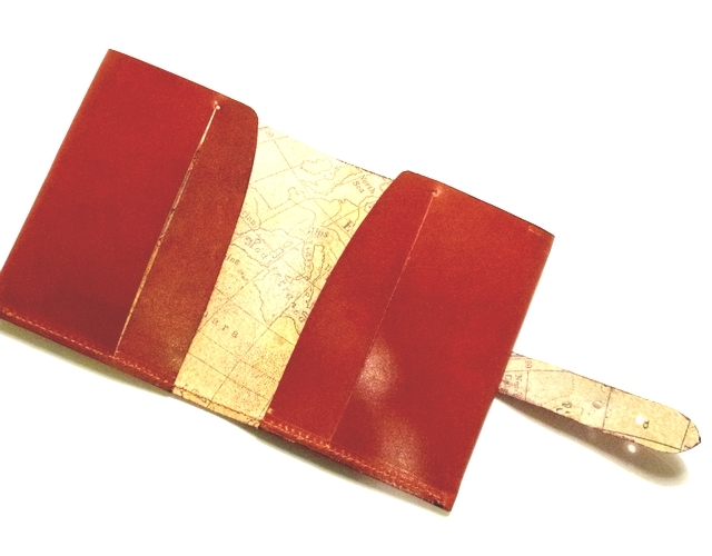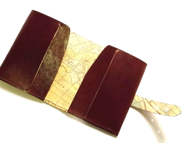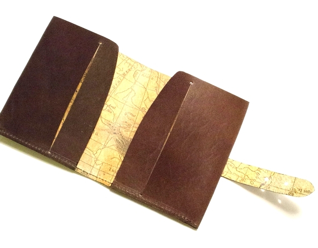 イタリア方式にならい、ヌメの銀面を機械とハンドでムラになるように染めていった特注の牛革の裏側にヴィンテージの地図をハンドプリントしました。