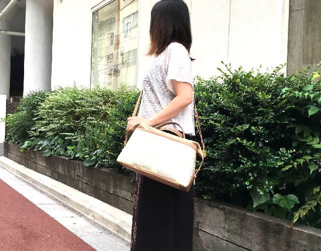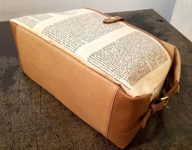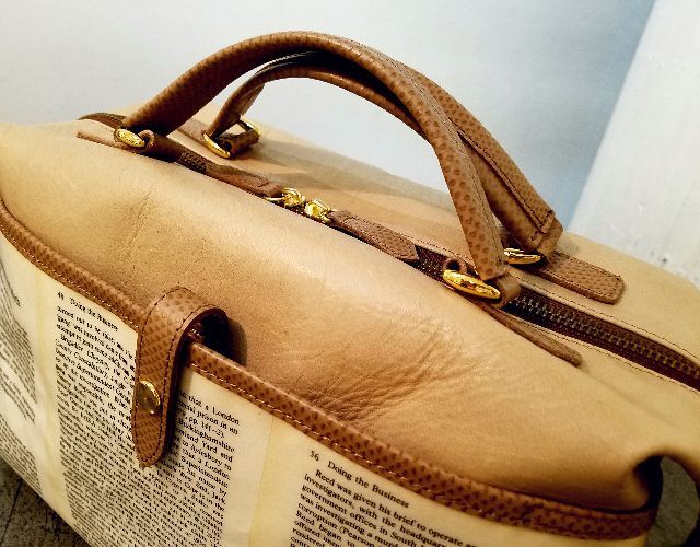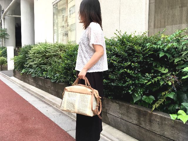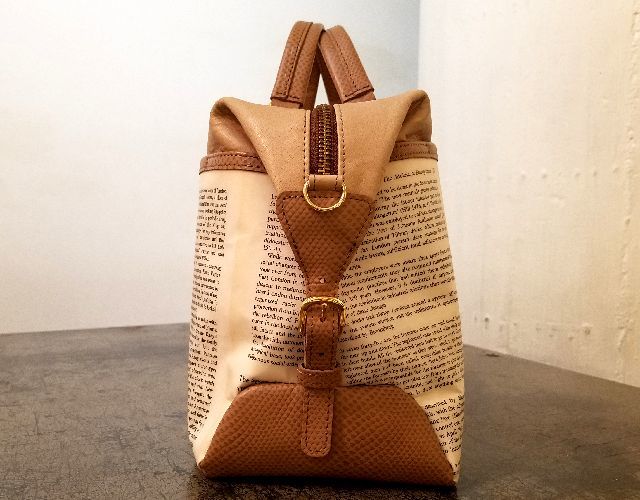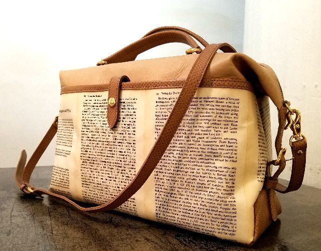 アメリカ、ヨーロッパの良く焼けた文庫本(ペーパーバック)を特別なプラスティックコーティングを手作業で施しています。ですので最初から少し使い込んだようないい雰囲気で持っていただけます。このベージュ色は季節やお洋服を選ばず、またアクセントとしても目を引く、美しいお色です。金具もゴールドをあしらい、エレガントさを増しています。台形のボストンバッグは見た目より沢山入ります。また、サイドのバックルを調整することにより四角になったり台形になったりと変化が楽しめます。ショルダーベルトも取り外し可能で肩掛け、斜め掛け、手持ち、とバリエーションが楽しめます。本物のペーパーバックを使用しているので同じ柄は二つとありません。内ポケットは両側に、大事なもの用のファスナー付と定期などを出し入れし易いファスナーなしとです。プラスティックコーティングは雨にも強くまた、縫製は東京の職人が丁寧に縫っています。